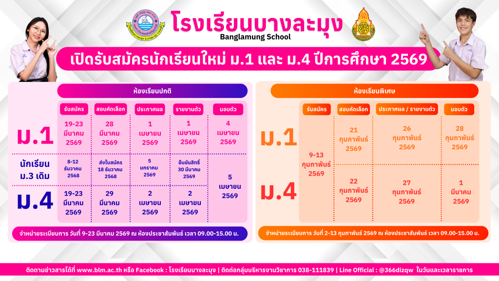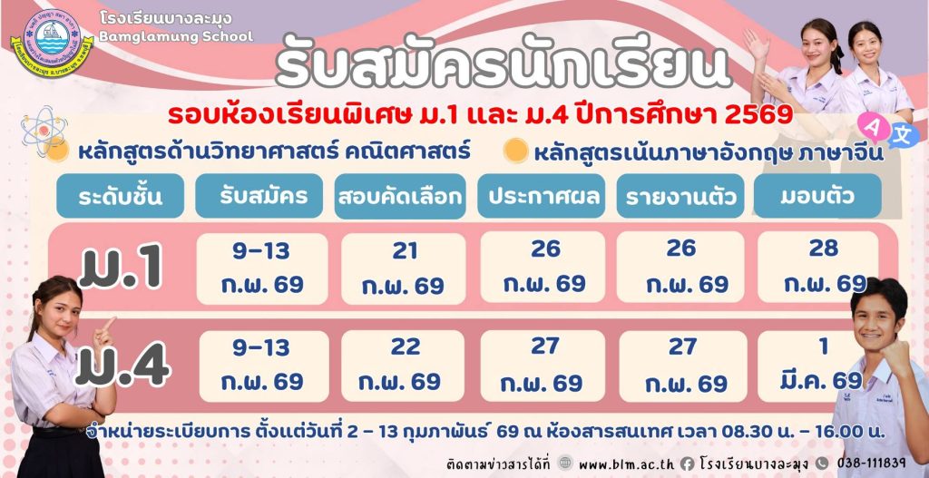 รับสมัครนักเรียนห้องเรียนพิเศษ ม.1 และ ม.4 ปีการศึกษา 2569 หลักสูตรด้านวิทยาศาสตร์ คณิตศาสตร์ และหลักสูตรเน้นภาษาอังกฤษ ภาษาจีน