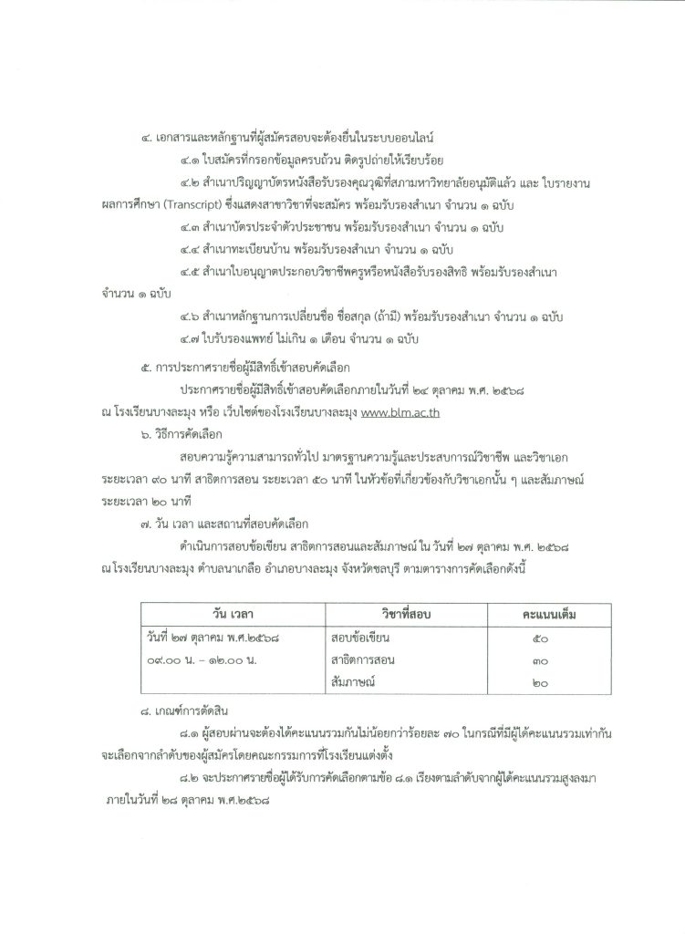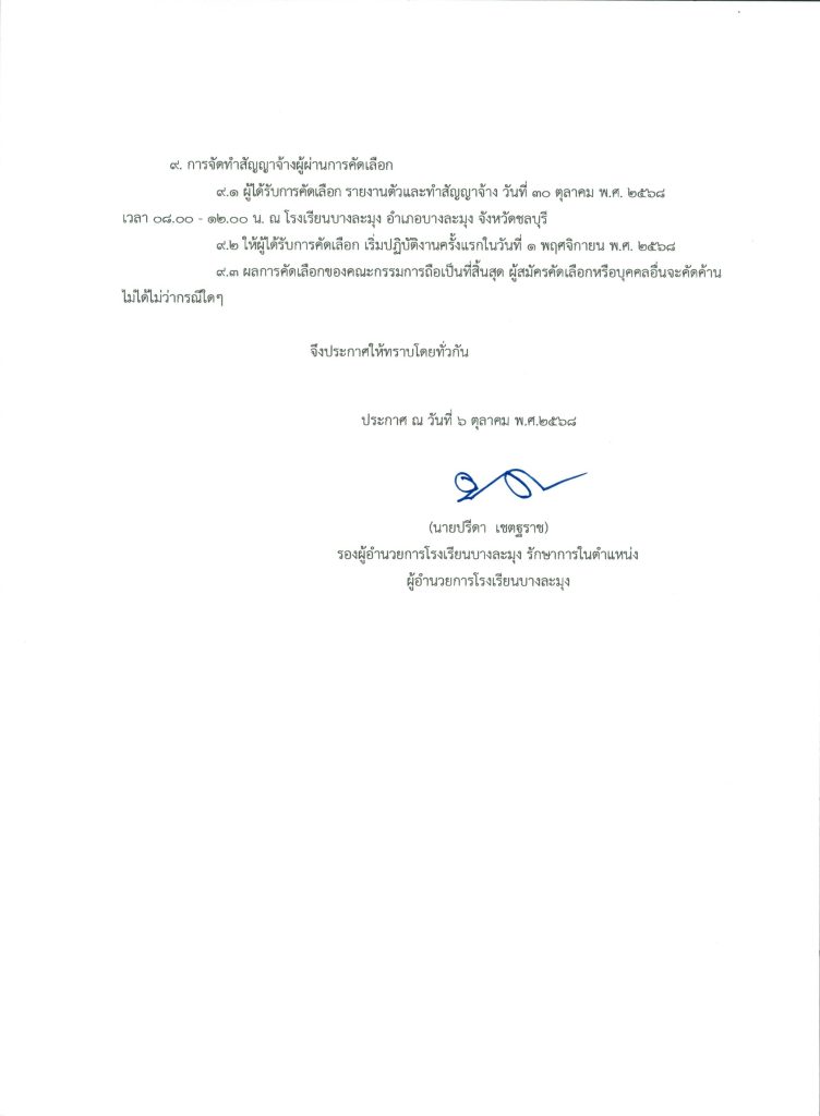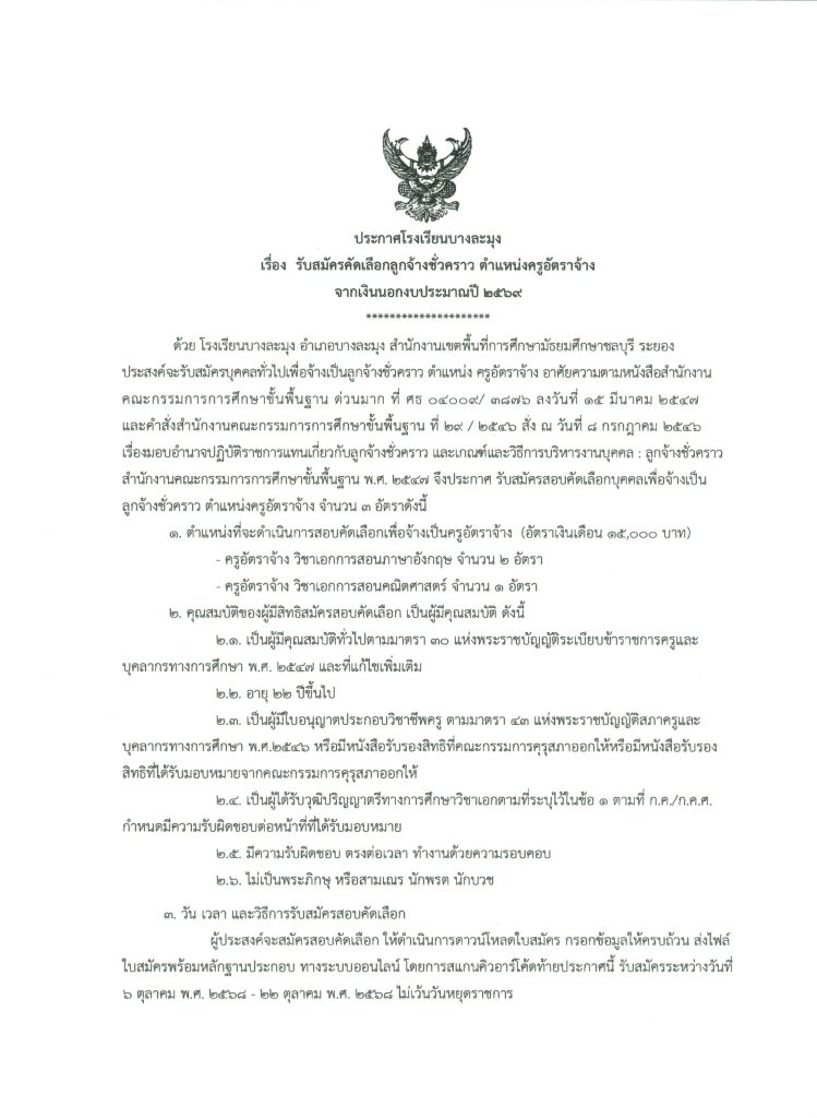 กลุ่มบริหารงานกลุ่มบริหารงานบุคคล การเงินและสินทรัพย์ ประกาศโรงเรียนบางละมุง เรื่อง รับสมัครคัดเลือกลูกจ้างชั่วคราว ตำแหน่ง ครูอัตราจ้าง จากเงินนอกงบประมาณปี 2569 7 ตุลาคม 2025 admin